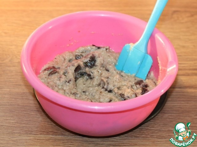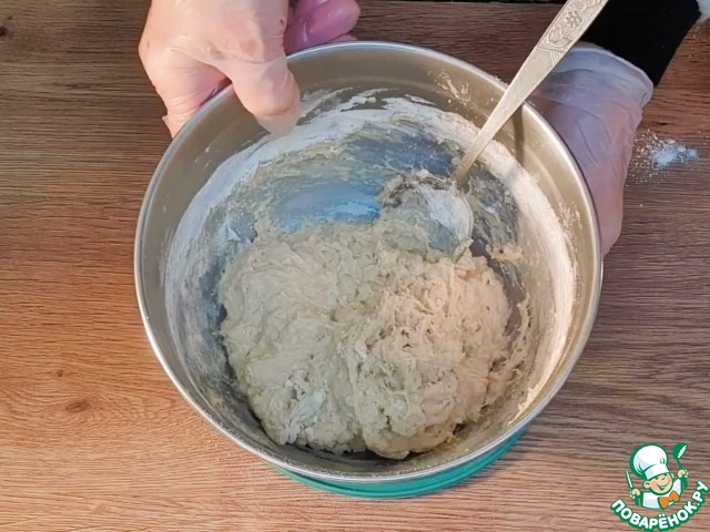4. Просеиваем небольшими частями муку 2/3 часть и замешиваем тесто вначале ложкой.