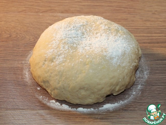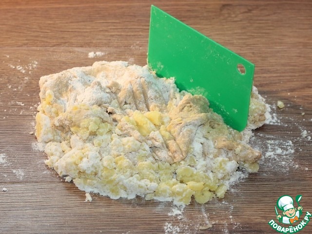 5. Затем подпыляем столешницу мукой и выкладываем тесто. Добавляем измельченный картофель 200 грамм. Посыпаем просеянной мукой 1/3 часть и вмешиваем картофель в тесто.