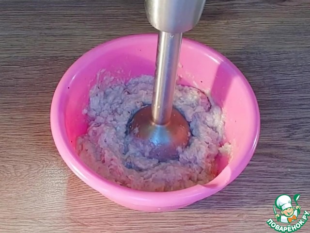 8. Пока подходит тесто, приготовим начинку. Очищенный лук (1 шт) нарезаем кубиками. Обжариваем 1/2 часть лука на разогретом растительном масле (1 ст. л.). Снимаем сковороду с огня и добавляем кусочки сливочного масла (2 ст. л.), растапливаем их. Затем смешиваем весь лук с фаршем и измельчаем блендером до однородности.