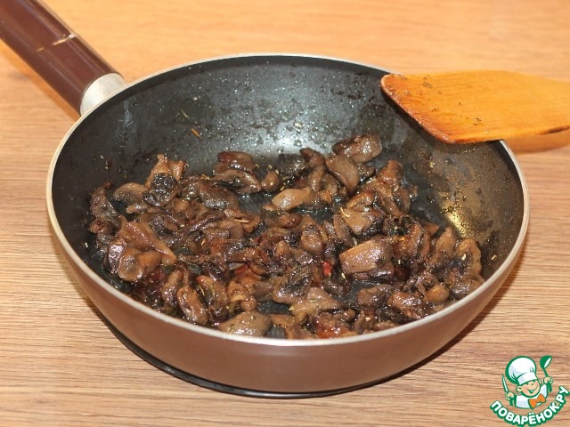 9. У меня подмороженные грибы (300 гр). Если у Вас свежие, готовьте так же. Нарезаем грибы небольшими кусочками и перемешивая, обсушиваем на сковороде до избавления жидкости., минут 7. Затем обжариваем на растительном масле (2 ст. л.) с добавлением специй до готовности.