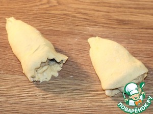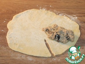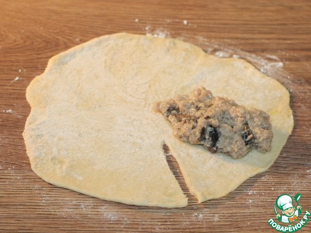 12. Раскатываем каждую часть теста в круглую лепешку с чайное блюдце. Делаем надрез до середины. Кладем начинку 1,5 ч. л.