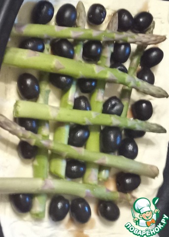 Разогреть духовку до 220С. В ёмкость для запекания выложить слоёное тесто и с помощью ножа сделайте надрезы по всему периметру теста, отступая 2,5 см от границы. Смазать тесто сливочным маслом (или по желанию сливочным сыром) и выложите маслины на поверхность. К маслинам добавить спаржу в произвольном порядке.
