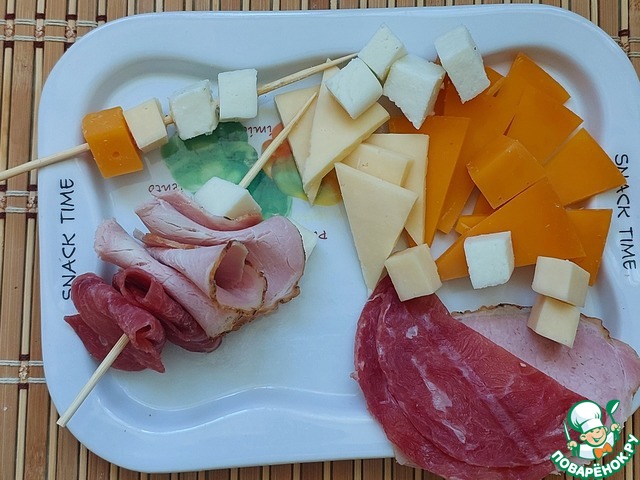 Сделать два шашлычка: сырный и мясной. Снизу мясного - кубик адыгейского сыра, для укрепления конструкции.