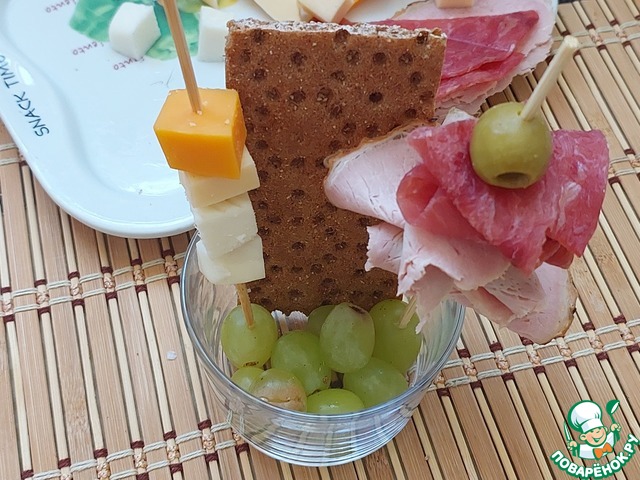 Собираем стаканчик. К задней стенке прислоняем хлебец и сыпем на дно виноград. Шпажки втыкаем в виноградины.
