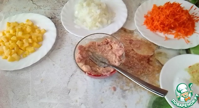 Лук и картофель нарежьте мелким кубиком. Морковь натрите на мелкой терке. Печень трески разомните при помощи вилки.