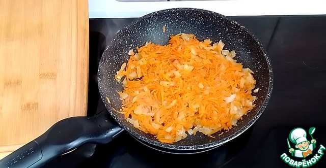 Затем добавьте морковь и жарьте до мягкости, периодически перемешивая. После чего уберите сковороду с огня.