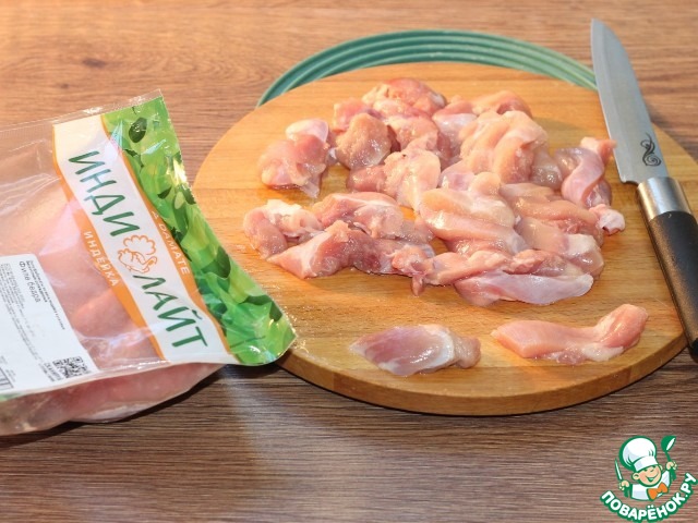 2. Нарезаем филе индейки маленькими кусочками на один укус.