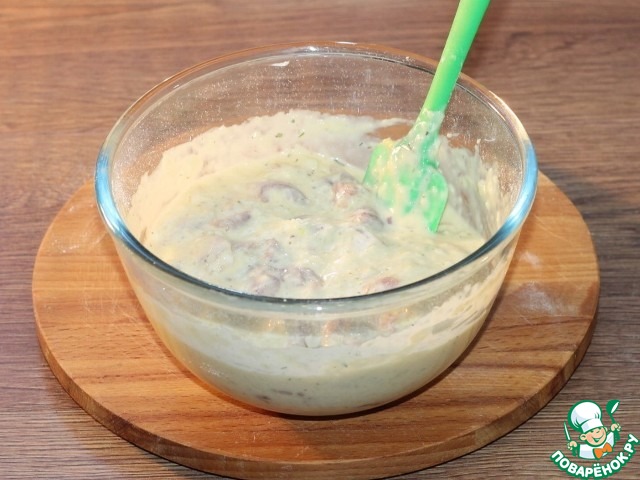 6. Переложите в миску с кляром, кусочки филе и перемешайте.