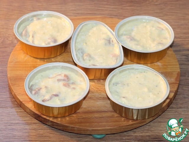 8... и разложите филе в кляре. Подъем выпечки небольшой, поэтому оставляйте в формочках немного сверху место.