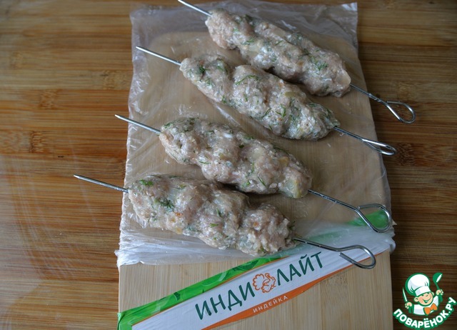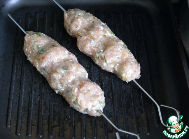 Из фарша формуем продолговатые котлеты. Нанизываем их на шампуры, слегка обжимая фарш вокруг шампур. Смазываем кебабы маслом, кладём на решётку мангала или сковороду-гриль.