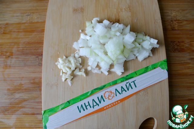 Обжариваем лук и чеснок на растительном масле до мягкости и румяности, добавляем к фаршу.
