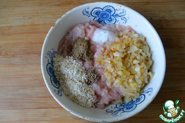 Также кладём в фарш зиру, смесь перцев, панировочные сухари, соль. -