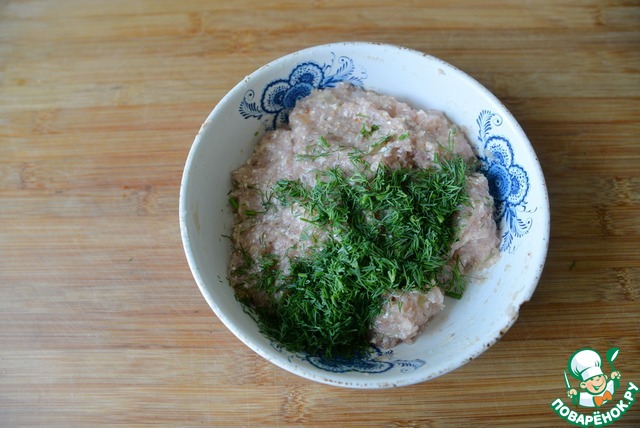 Тщательно вымешиваем фарш и отбиваем около 10 минут. Добавляем рубленую зелень, перемешиваем. Ставим в холодильник на 2 часа.