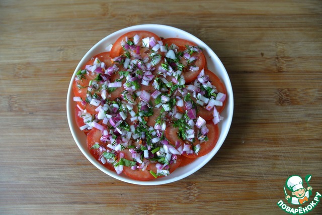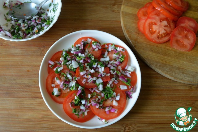 В салатнике (тарелке) кладём слой помидоров, на него слой маринада, далее опять стой помидоров, и снова - маринад.