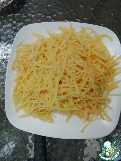 Картофель натереть на тёрке для моркови по-корейски. Промокнуть салфеткой.