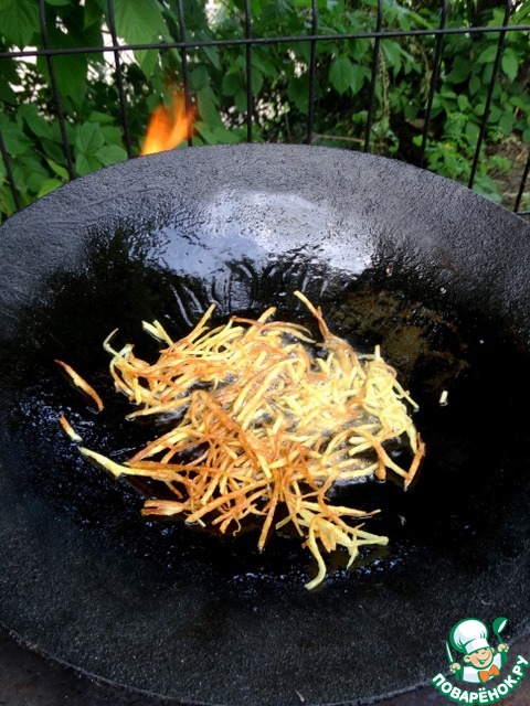 Жарить картофель в горячем масле, небольшими партиями до румяного состояния. В конце посолить.