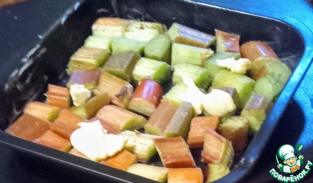 Разогрейте духовку до 200С. Смазываем форму для запекания сливочным маслом Выкладываем ревень, сливочное масло, сахар и корицу (по желанию). Перемешиваем.