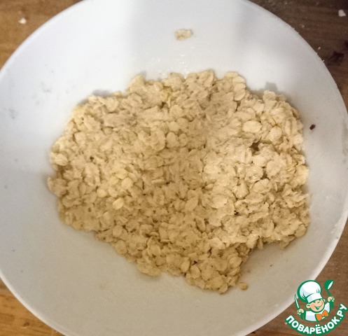 Делаем засыпку, смешав натертое масло, соль, овсяные хлопья и миндаль. Тщательно перемешиваем. Выкладываем топпинг на начинку. Отправляем ёмкость для запекания в морозилку на 10 минут или в холодильник от 30 минут до 48 часов.