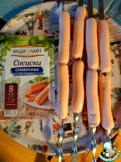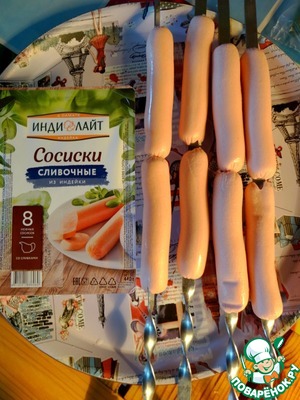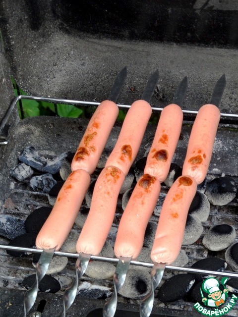 Сосиски нанизать на шампуры.