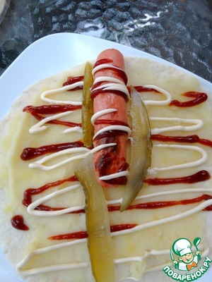 Выложить сосиску или лучше две), маринованный огурец, полить соусами.
