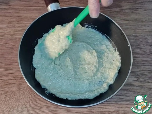 12. Немного смазываем сковороду (ф=20 см) растительным маслом и разогреваем. После нагрева, размазываем силиконовой лопаткой тесто 2 ст. л. (с горкой) по сковороде.