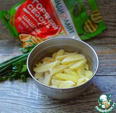 Картофель вымыть, почистить и нарезать тонкими ломтиками. Залить крутым кипятком с небольшим количеством соли. Накрыть крышкой и оставить на 5-7 минут.