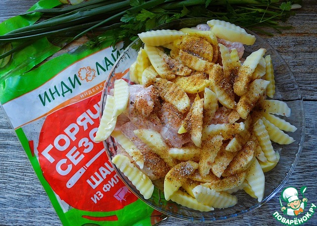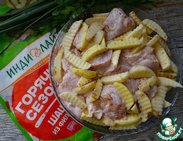 Выложить в огнеупорную форму полуфабрикат шашлыка с маринадом, добавить к нему картофель, специи.