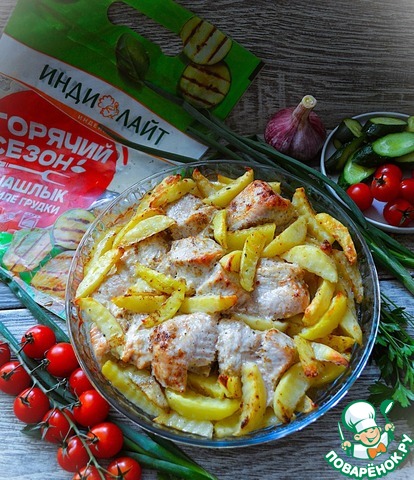 Не всегда удаётся разжечь мангал для шашлыка. Предлагаю вариант приготовления шашлыка в духовке - запечь, ещё и с картофелем. Добавьте немного зелени и овощей и у вас полноценный пикник. А чтобы не заморачиваться с маринадом, берём полуфабрикат от ТМ Индилайт, шашлык из грудки.