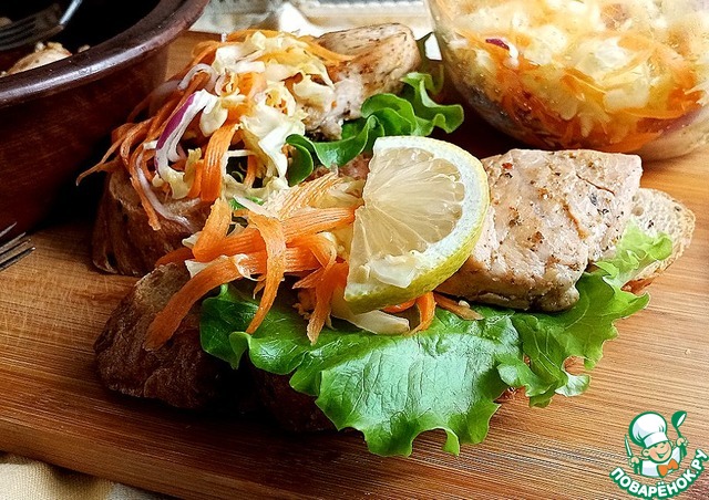 • Я сделаю брускетты с ними на чиабатте. Чиабатту порежу на куски и подсушу их на сухой сковороде, на природе можно - на решётке или гриль - сковороде прямо на мангале. На чиабатту выложу салатные листики, на них - медальоны с одного края, помещу капустный салат и сверху выложу полудольки лимона.