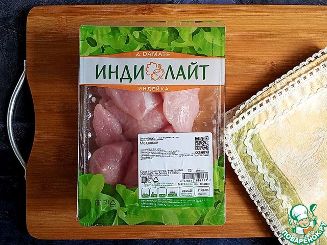 • В рецепте я буду использовать медальоны от ТМ ИНДИЛАЙТ 500 г целую упаковку. Медальоны уже нарезаны.