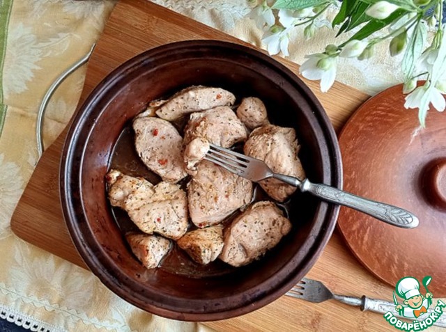 • Индейка замариновалась. Медальоны можно обжарить на гриль-сковороде, на гриле или запечь в духовке. Я ем мало жареной еды и я их запеку на кеци в духовке по своему вкусу. Я не буду сильно медальоны румянить. На кеци медальоны выделят свой сок и в нём приготовятся. Я запекала 30 минут при Т-180 С. Если нет кеци, запеките в любой керамической или глиняной посуде. Ароматные потрясающие сочные медальоны получились в готовом виде.
