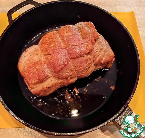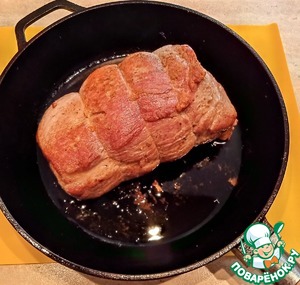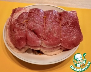 Мясо помыть, обсушить и натереть солью и перцем. Перевязать шпагатом через каждые три сантиметра для того, чтобы сохранить форму.