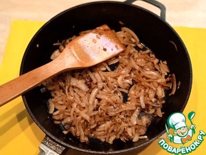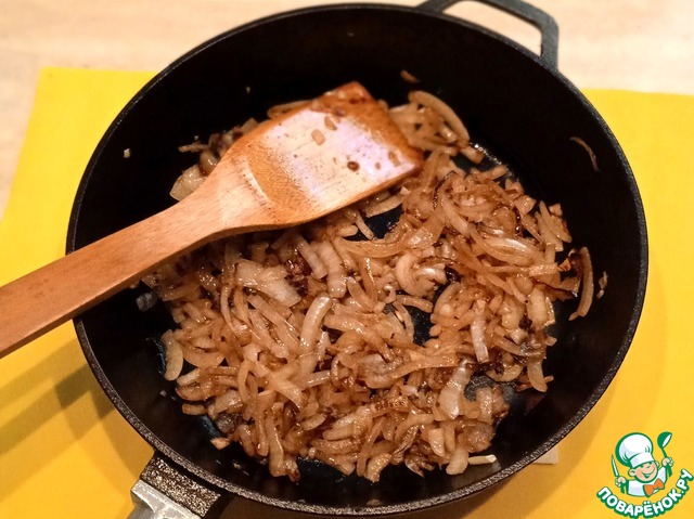 На этой же сковороде обжарить лук, нарезанный четверть кольцами до характерного аромата и лёгких подпалин. Если требуется, то добавить немного масла. В конце жарки добавить чеснок, мелко рубленный.