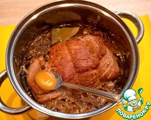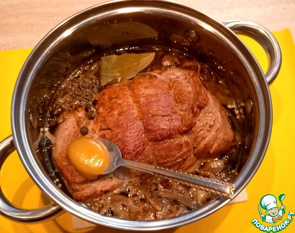 В кастрюлю к мясу переложить лук, влить сидр и бульон, добавить специи (3-4 шт душистого горошка, 1-2 листа лаврушки и тимьян), не полную чайную ложку мёда.