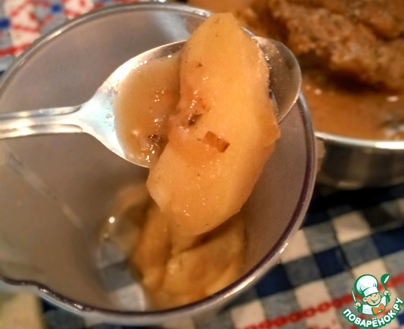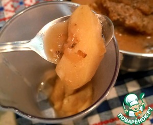 Яблоко очистить от кожуры и семян, нарезать дольками. Добавить к мясу после двух часов тушения и продолжить готовить ещё 30-40 минут.