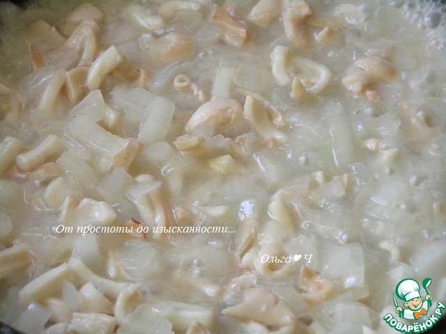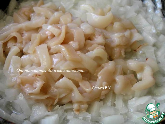 Лук нарежьте и слегка обжарьте на растительном масле, добавьте очищенные и нарезанные кальмары.