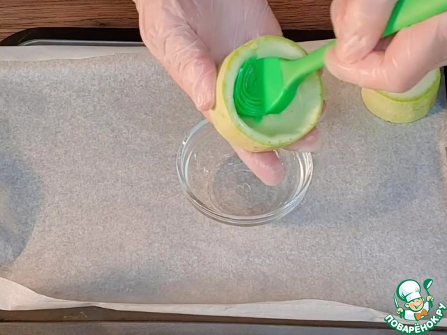 4. Смазываем кабачковые стаканчики растительным маслом, переворачиваем и раскладываем на противне. Ставим противень с заготовками в разогретую до 180 С духовку на 30 минут или до полуготовности кабачков.
