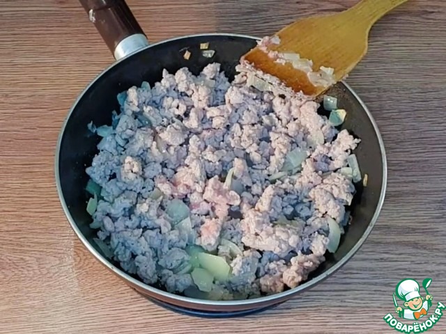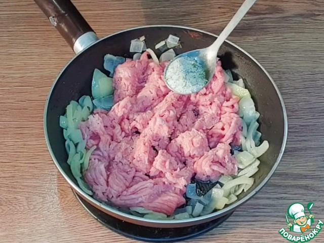 6. К обжаренному луку, добавляем фарш 250 г.