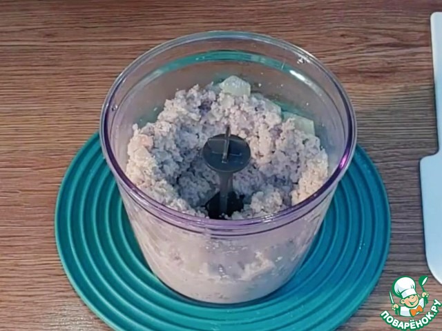 8. Перекладываем лук с фаршем в чашу блендера и измельчаем.