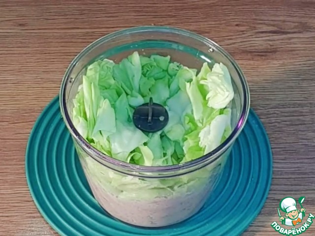 9. Затем кладем в чашу, кусочки капусты 100 г и еще раз измельчаем блендером.