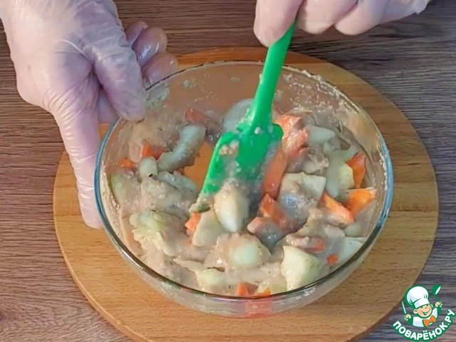 17. Оставшийся соус смешиваем с начинкой, морковью и мякотью кабачка.