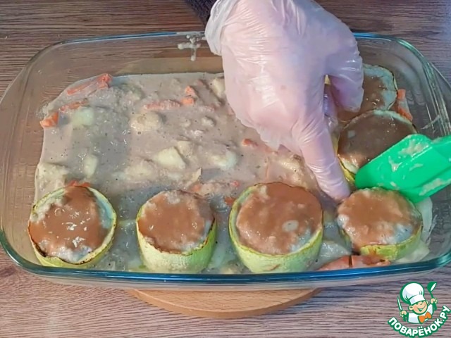 18. Выкладываем смесь в форму для выпечки. На подложку, раскладываем кабачковые стаканчики. Прикрываем форму фольгой и ставим в духовку, разогретую до 190 С на 45 минут.