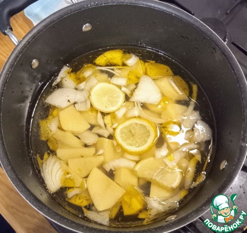 В глубокой ёмкости смешать оливковое масло, 600мл воды, соль, тимьян с дольками и соком 1 лимона. Добавить лук и картофель. Довести до кипения и варить 10 минут до мягкости картофеля и лука.