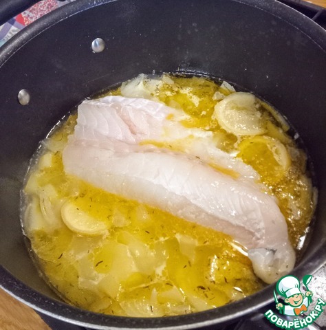 К овощам добавить треску. Должно так получится, что она погрузится не полностью, а только наполовину.