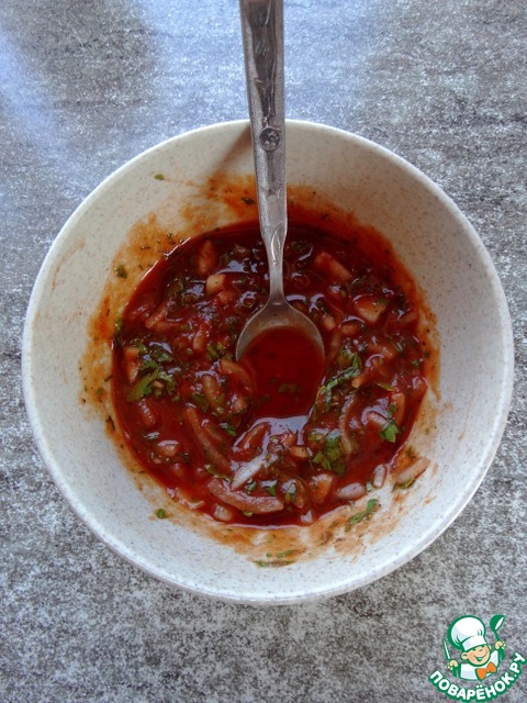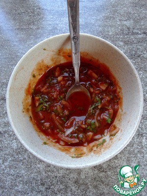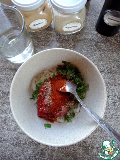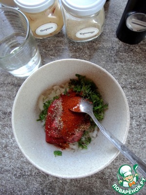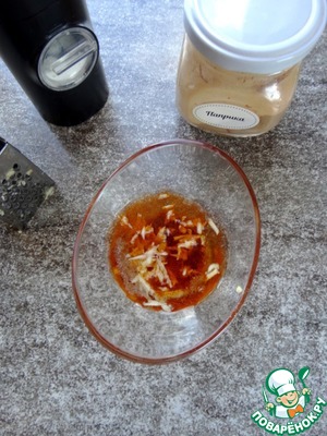 В масло измельчить чеснок, добавить соль и паприку (тут "на глаз"). -