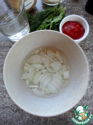 Лук нарезать четверть кольцами или кубиком. Залить водой, чтобы покрывала, добавить уксус. Оставить на 10-15 минут.