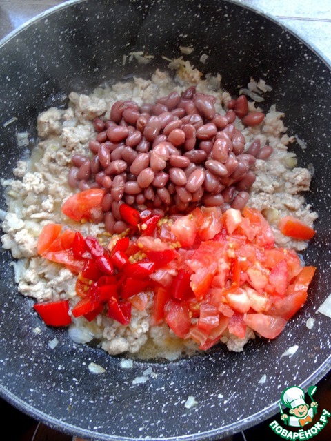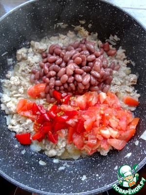 Добавить в луково-чесночный фарш нарезанные помидоры, фасоль без жидкости и острый перец (у меня он уже был нарезан).