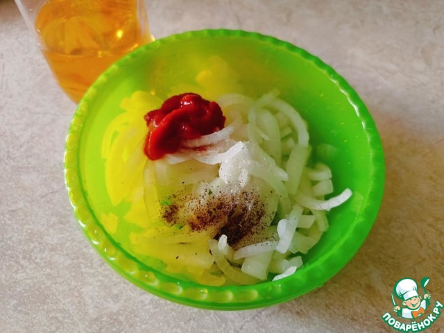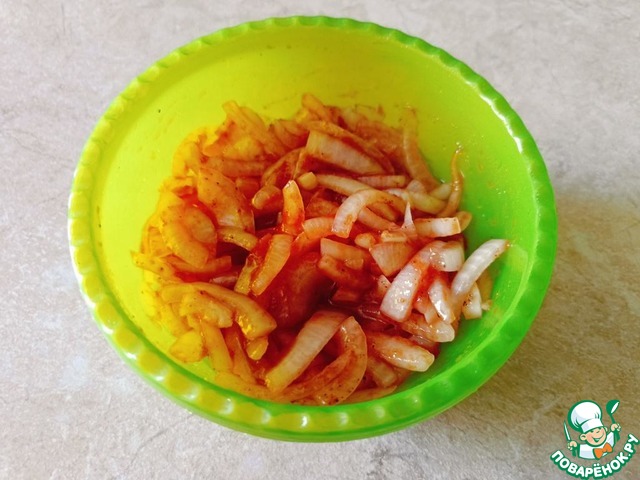 Большую луковицу (или две средних) Нарезать четверть кольцами. Закипятить чайник и залить лук горячей водой буквально на полминуты. Не лейте сразу кипяток, пусть будет градусов 90. Затем воду слить и промыть лук холодной водой. Откинуть на дуршлаг, чтобы стекла вода.