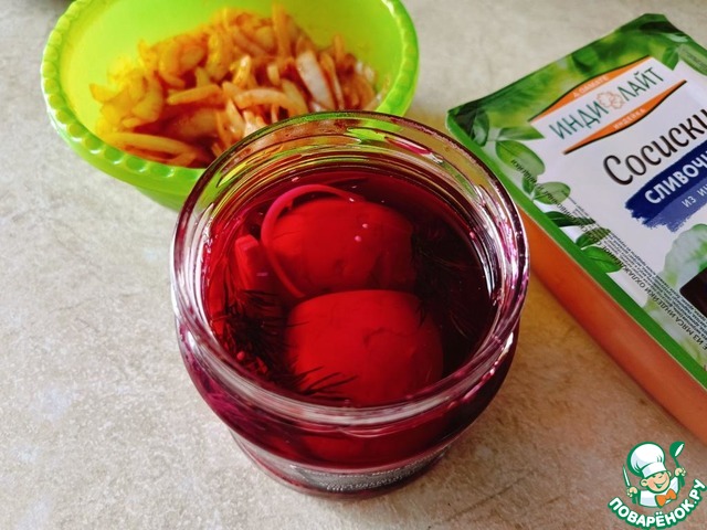 Рецепт «Сосиски с маринованными яйцами и луком»: