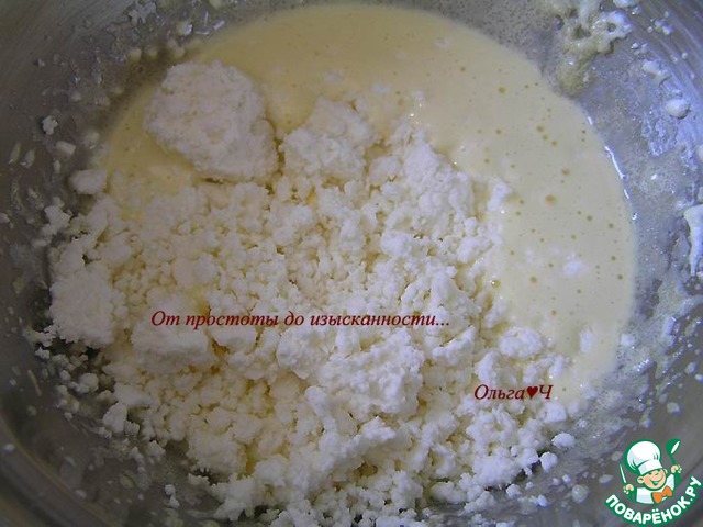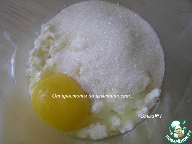 Для теста соедините яйцо, творог, сахар и ванилин.